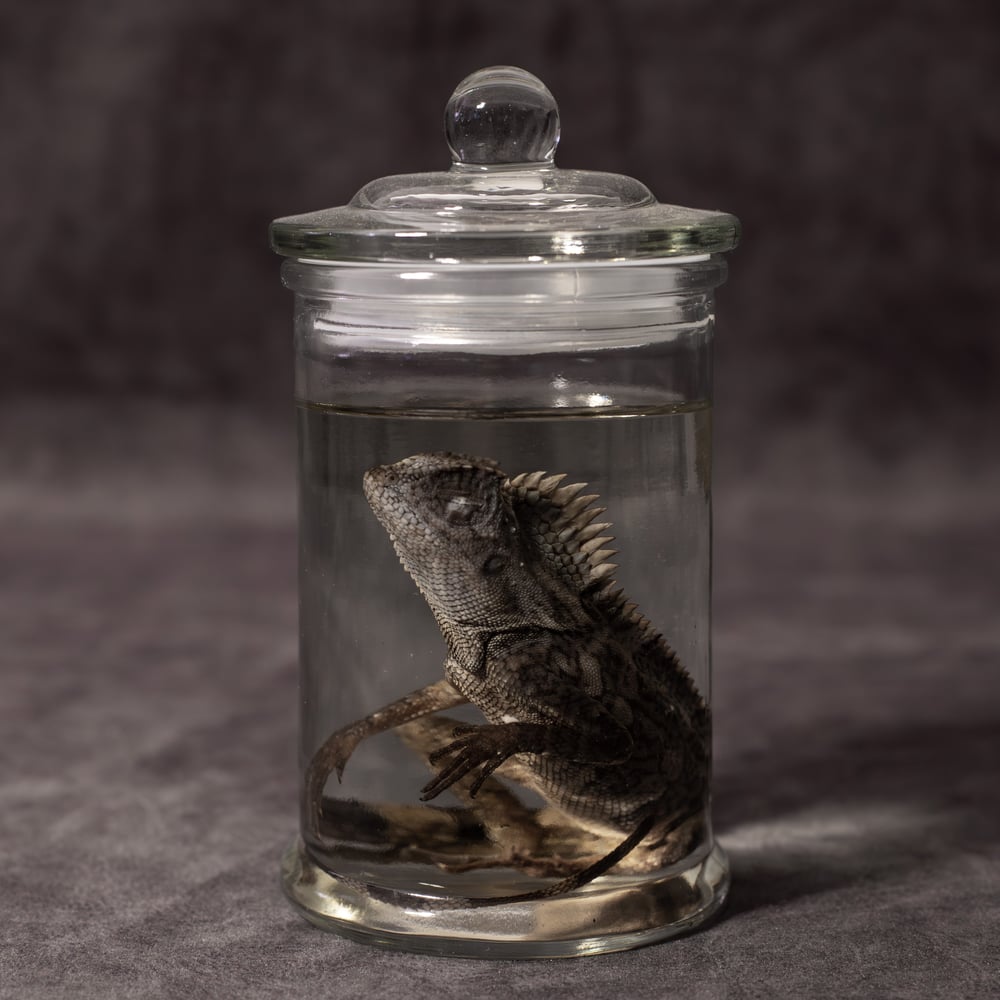 This chameleon forest dragon has been professionally preserved and now sits in 70% isopropyl alcohol.