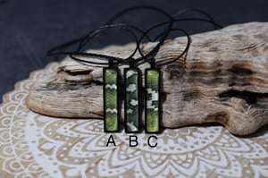 The pendants measure 1/2” x 2”. A is on a 16" adjustable simple cord, B is on a 20" braided cord, and C is on a 20" simple cord.